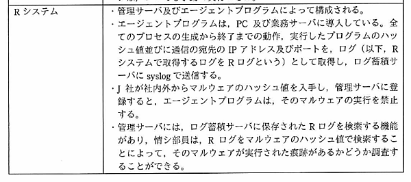 Rシステムは、業務端末に導入されるエージェントによってプロセスの動作やプログラムのハッシュ値、通信先等のログ(Rログ)を取得し、管理サーバーに蓄積しており、管理サーバーの機能としてハッシュ値の拒否リスト登録やログの検索機能が備わっていることが分かります。