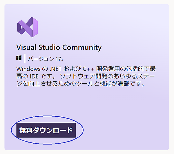 https://visualstudio.microsoft.com/ja/free-developer-offers/を開き、[無料ダウンロード]ボタンをクリックしてインストーラをダウンロードします。