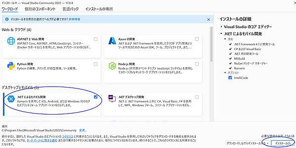 インストーラを起動し、以下の画面が表示されたら[.NETによるモバイル開発]をチェックし、[インストール]ボタンをクリックします。