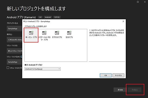 今回は、Xamarin(Android)のテンプレートを使用します。プロジェクト名を指定(ここでは「SampleApp」とします)し、[作成]ボタンを押下します。テンプレートの選択画面になりますので、今回は単一ビューアプリを選択します。