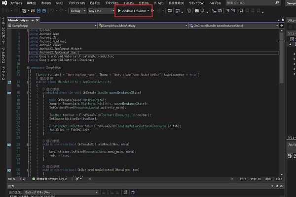 プロジェクトを作成 Visual Studio 2022のインストールが完了したところで、アプリ開発テンプレートを使用してモバイルアプリケーションプロジェクトを作成します。今回は、Xamarin(Android)のテンプレートを使用します。プロジェクト名を指定(ここでは「SampleApp」とします)し、[作成]ボタンを押下します。テンプレートの選択画面になりますので、今回は単一ビューアプリを選択します。作成が完了すると、Visual Studioがソリューションを開いた状態になります。すでにアプリケーションを起動するための一通りのファイルが配置された状態になっているので、実際にアプリケーションを起動してみましょう。 画面上部の[▶︎(デバッグ)]ボタンを押下してデバッグを開始します。初めてAndroidアプリをデバッグする場合には、デバッグに利用するAndroidデバイスがセットアップされます。Androidデバイスがセットアップされていると、デバイス名が[▶︎]ボタンに表示されます。改めて[▶︎]ボタンを押下してアプリケーションを起動してみましょう。デバイスの起動からアプリケーションのビルドとデバイスへの配置まで行われるため時間がかかりますが、起動するまで待ちましょう。 Android Emulatorの画面に「Hello World!」が表示されたら成功です。成功したら、同じく画面上部の[▷]ボタンを押下してデバッグを終了します。Realm DBへの接続 以上で、プロジェクトの作成まで完了しました。次回以降はこのプロジェクトを利用してアプリケーションを実装していきます。とは言え、今回はこれで終わりというのも味気ないので、このままRealm DBへ接続してみましょう。前回で作成したRealm DBにSyncし、保存されているデータを取得します。前回の作業が前提となるので、未実施の場合はそちらを先行してください。 なお、本プロジェクトのソースコードはGitLabのリポジトリに格納しています。コードに詳細なコメントも記載しているので、適宜参照してください。 さて、まずはRealmの動作に必要なパッケージを取得します。ソリューションエクスプローラを開き、「参照」を右クリックして「NuGetパッケージの管理」を選択してください。検索ウインドウに「realm」と入力して、Realmパッケージをインストールします。パッケージのインストールが完了したら、アプリケーションの実装に入ります。ここではアプリケーションにSyncボタンを配置し、押下されたらRealm DBに接続するように実装します。まずはUIを設定します。プロジェクトフォルダから「Resources」→「layout」配下にある「content_main.xml」ファイルを開きます。開いたら、コードエディタを利用して下記のコードを記述してください。 <?xml version="1.0" encoding="utf-8"?> <LinearLayout xmlns:android="http://schemas.android.com/apk/res/android" xmlns:app="http://schemas.android.com/apk/res-auto" xmlns:tools="http://schemas.android.com/tools" android:layout_width="match_parent" android:layout_height="match_parent" app:layout_behavior="@string/appbar_scrolling_view_behavior" tools:showIn="@layout/activity_main" android:orientation="vertical"> <Button android:text="SYNC" android:layout_width="wrap_content" android:layout_height="wrap_content" android:id="@+id/SyncButton" /> <TextView android:text="" android:textAppearance="?android:attr/textAppearanceLarge" android:layout_width="match_parent" android:layout_height="wrap_content" android:id="@+id/ResultText" /> </LinearLayout> これでUIの設定は完了です。Buttonタグをビューに記述したので、アプリに[SYNC]ボタンが表示されるようになりました。 次に処理を実装しましょう。まず、前回で利用したModels.csを利用します。そのままファイルをSampleAppプロジェクト直下に配置してください。続いて、[SYNC]ボタン押下の処理を記述します。SampleAppプロジェクト直下に配置されている「MainActivity.cs」を開いてください。 「MainActivity.cs」はユーザインターフェースの処理を記述するためのファイルです。Xamarin Androidではアプリケーションの画面をActivityクラスを継承するクラスを定義することで記述します。ここに記述されているMainActivityクラスもそのひとつです。MainActivityクラスではMainLauncherプロパティがTrueに設定されているため、アプリ起動時にはじめに表示される画面になっています。 まず、使用するライブラリを追記します。ファイル冒頭のusing句に下記を追加します。 using Realms.Sync; using Realms; using Android.Widget; using System.Linq; using CreationLine.SampleApp.BasicRealmOperation; 続いて処理を実装していきます。Activityクラスの記述のうち、画面が表示される際に呼び出されるのが「OnCreate」関数です。ここでは[SYNC]ボタンの処理をこの「OnCreate」関数に記述します。OnCreate関数を下記のように書き換えてください。 protected override void OnCreate(Bundle savedInstanceState) { base.OnCreate(savedInstanceState); Xamarin.Essentials.Platform.Init(this, savedInstanceState); SetContentView(Resource.Layout.activity_main); AndroidX.AppCompat.Widget.Toolbar toolbar = FindViewById<AndroidX.AppCompat.Widget.Toolbar>(Resource.Id.toolbar); SetSupportActionBar(toolbar); FloatingActionButton fab = FindViewById<FloatingActionButton>(Resource.Id.fab); fab.Click += FabOnClick; But