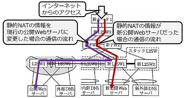 (4)と同じくシステム切替作業の内容について考察する問題です。11ページの下線部⑩の状態にすることで、インターネットから現行の公開Webサーバへの通信の流れはインターネット→新ルータ1→新L2SW0→新FW1→新L2SW1→L2SW1→公開Webサーバとなります。また、10ページ1行目から3行目に「新FW1及び新FW2には,(略) 静的NATを設定する」と記述されています。そのため、インターネットからの通信を新公開Webサーバから現行の公開Webサーバに切り替えるには、新FW1及び新FW2に登録されている静的NATの情報を変更すれば実現できそうです。