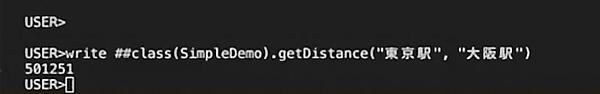 それでは定義したメソッドを実行してみましょう。ターミナルでIRISコンソールを開き、「東京駅」と「大阪駅」を指定してgetDistanceメソッドを呼び出すと、約501,251mという結果が表示されました。