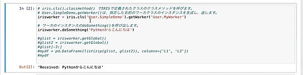 再びJupyter Notebookに戻り、コードを実行します。IRIS側で定義された2つのクラスが連携し、それが、あたかもPythonのコードのように動いています。これはIRIS側で定義したクラスと、そのクラスのメソッドをPythonコードから呼び出すことで何らかの業務上の処理を行えることを示しています。