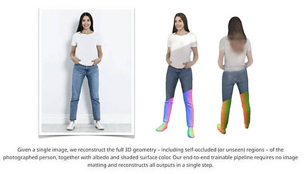 「PHORHUM」は、服を着た人間のRGB画像から、3次元の形状と外観を写実的に再現するための、ディープニューラルネットワーク手法です。見える範囲は正確に再現しつつ、見えない部分は推定を行って「それらしい」再現を行います。