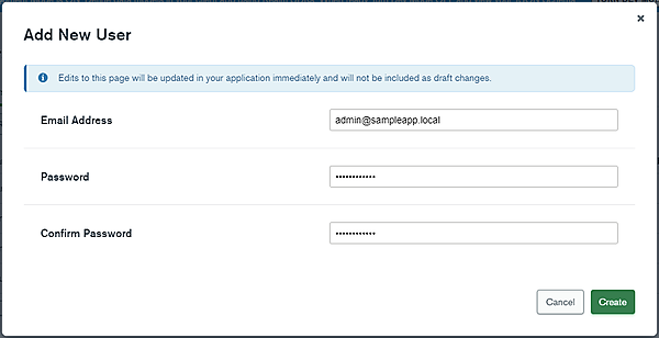 2. [Email Address][Password][Confirm Password]に適当な値を入力し、[Create]ボタンをクリックする。ここでは“admin@sampleapp.local”とする。パスワードは前回でアプリ上の制限(英数字のみで8〜16文字)を設けているため、その制限に合わせて入力する