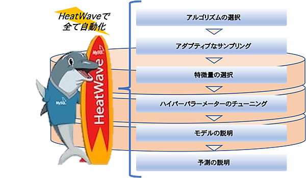 MySQL HeatWave MLでは、開発者もしくは利用者はSQLのみを実行します。今まで開発者がプログラミングをしてきたデータの前処理/アルゴリズムの選択/アダプティブなサンプリング/特徴量の選択/ハイパーパラーメーターのチューニング/モデルの説明/予測の説明の各項目がMySQL HeatWave MLにて自動で実施されます。これらの機械学習における主要部分が自動化されることにより、これまで機械学習における高い専門性や機能開発の設計やプログラムが全て不要となりました。