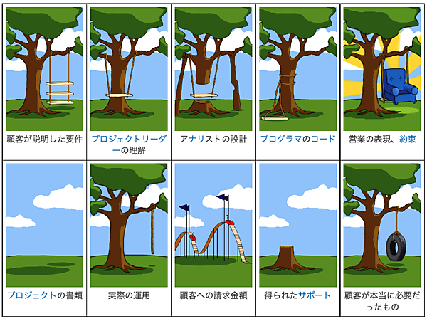 これは「顧客が本当に必要だったもの」と呼ばれる絵で、そもそも顧客が要件を正しく説明できず、依頼された側も顧客の要件を取り違えたり、関係者がそれぞれの立場で勝手な解釈をしてしまったり、顧客も含めて必要とするものを誰も分かっていなかったことを風刺した絵です。IT業界で働いていると、時々この風刺に近いトラブルを耳にしますが、なぜIT業界ではこのようなことが発生するのでしょうか。それは、議事録の話でも書きましたが、ITの仕事では、基本的に生み出される成果物が目に見えないものであるため、製品やサービスの代わりに資料や設計書、テスト結果などの情報を整理し記載・説明していく活動が必要になります。そのため他の仕事に比べて特に高度な情報収集・整理・伝達能力が必要であり、それらが甘くなることで上記のような風刺に繋がるトラブルが発生するのです。