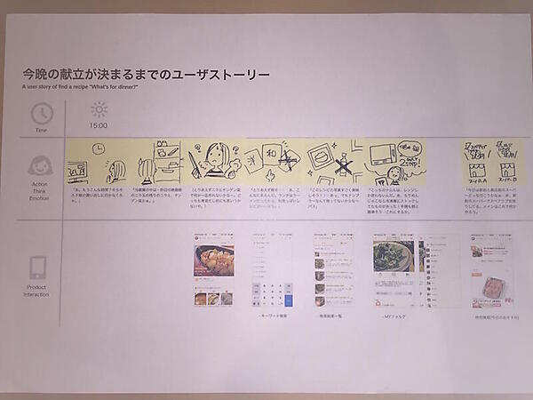 メンバーに好評だったのが、「画面の外側のことがわかる」という点でした。ユーザーがクックパッドを「使う前」や「中断し、次に使うまでの間」に何をしているのか、というところです。「家の冷蔵庫には、ニラと青梗菜しかない」という制約や、子供のお迎えまであと15分しかなくて、買うものをすぐ決めてスーパーに行かないといけない、という状況のなかにいる。そういう制約が発生しているからこそ、クックパッドを使うんだ、というのが、このようにひとつの資料にすることで、わかりやすく伝わりました。