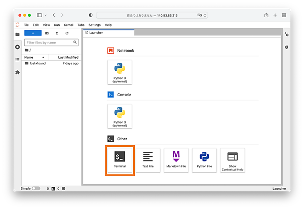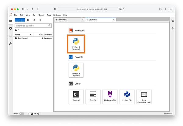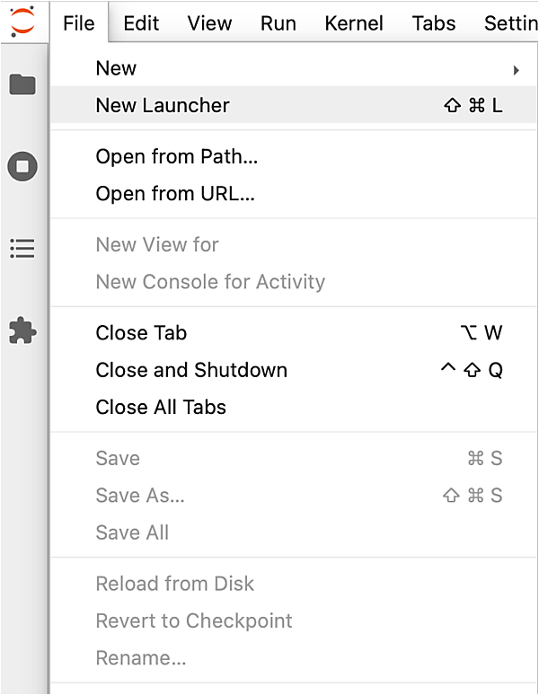 pip3 install pymysql - 必要なモジュールをインストールしたので、接続確認をします。新しいNotebookの起動するために、FileメニューからNew Launcherを選択します。