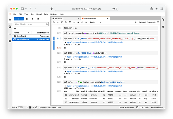 これで、Jupyter NotebookからMySQL HeatWave MLへ接続できました。