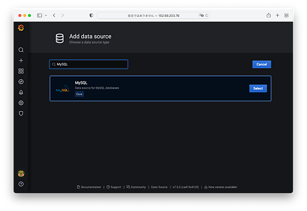 - フィルタテキストボックスに「mysql」と入力して、MySQLデータソースを検索します。MySQLが表示されるので、データソースの[選択]ボタンをクリックします。