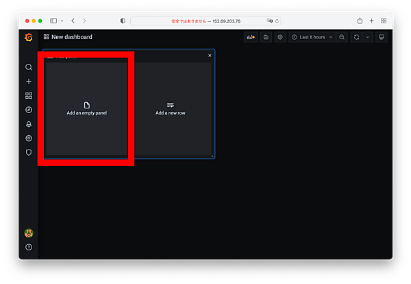 - MySQLへ接続できたら、パネルを追加してみましょう。[Add Panel]より左側の[Add an empty panel]をクリックします。