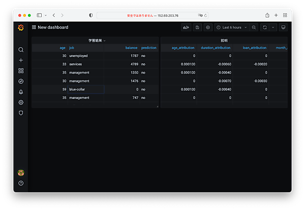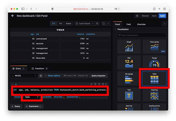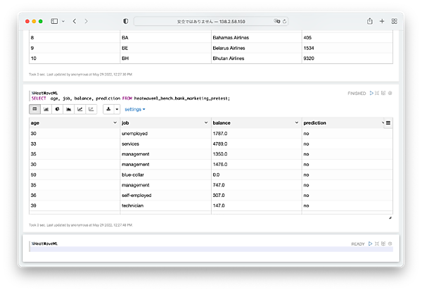 また、[Format as]は[Table]を選択し、右メニューの表示形式も[Table]を選択します。SELECT age, job, blance, prediction FROM heatwaveml_bench.bank_marketing_pretest; - 完了後の出力例です。今回は左側に学習結果を、右側に結果説明を対比させて表示しています。利用シーンに合わせて様々なパネルを作ってみてください。