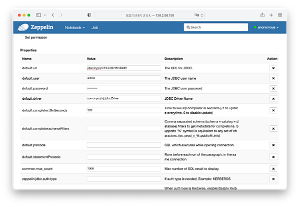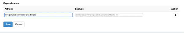 プロパティ名 設定値 default.url jdbc:mysql://<MySQL-IP-ADDRESS>:3306 default.user データベースユーザ default.password データベースパスワード default.driver com.mysql.cj.jdbc.Driver - ページの一番下までスクロールし、MySQL JDBCドライバーを指定します。ここでは「mysql-connector-java:8.0.29」を指定しています。