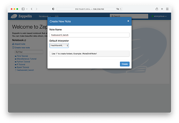 - 新しいノートブックを作成して、MySQL HeatWave MLへの接続を開始します。作成したJDBCインタープリターが選択可能になっていることを確認してください。