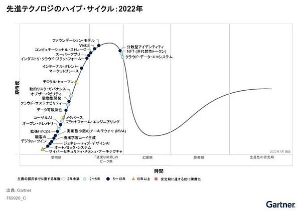 米国の調査会社ガートナーは8月16日、「先進テクノロジのハイプ・サイクル:2022年」を発表しました。黎明期の技術として「メタバース」が新たに登場しています。