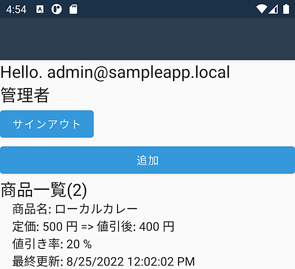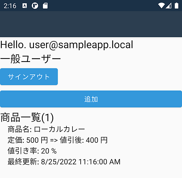 今回は、一般ユーザーがモバイルアプリにサインインしたときの動作を作っていきます。前回までに作成した機能では一般ユーザーも管理者ユーザーと同じ操作ができてしまうため、一般ユーザーには制限を設けて商品情報一覧だけが表示されるようにしていきます。