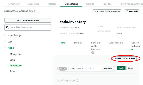 続いて、モバイルアプリと同期しているMongoDB Atlasのコレクションを見てみましょう。データが沢山ある場合はフィルタ機能を使ってみてください。FILTERと書かれている右側に {item: 'ローカルカレー'} と入力して [Apply] ボタンを押すと検索できます。