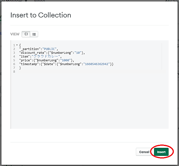 次に、MongoDB Atlasから商品情報を追加してみましょう。先ほど確認したコレクションから [INSERT DOCUMENT] を開いて以下のドキュメントを入力し、[Insert] ボタンを押してコレクションに追加します。
