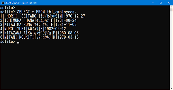INSERT INTO tbl_employees (code,name,kana,gender,birthday) VALUES ('1',' HORII SEITARO ','ホリイセイタロウ','M', '1970-12-27') ,('2','ISHIMURA HANA','イシムラハナ', 'F','1981-08-24') ,('3','KITAJIMA RUNA','キタジマルナ','F', '1981-11-09') ,('4','MUROI YURI','ムロイユリ','F', '1982-02-12') ,('5','KITAZAWA AIKA','キタザワアイカ','F', '1980-08-05') ,('6','MITANI KOUKITI','ミタニコウキチ','M', '1979-03-16'); - コマンドラインに「