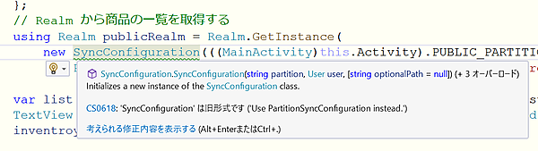 TopFragment.csとEditFragment.cs内で、Realmライブラリの「SyncConfiguration」というクラスのオブジェクトを作成しています。新バージョンインストール後にその部分を確認すると「‘SyncConfiguration’は旧型式です」という警告が表示されるようになります。