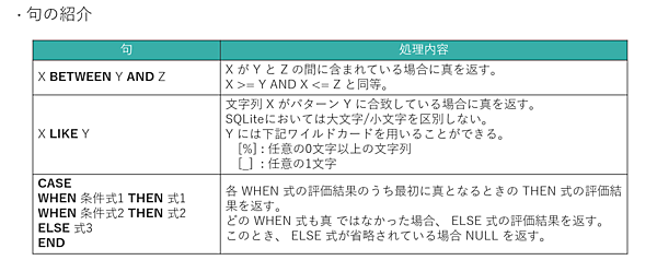 今回は、下表に示す3つの句、WHEREの中で利用される「BETWEEN」と「LIKE」、そして、SELECTの中で利用される「CASE」を紹介します。