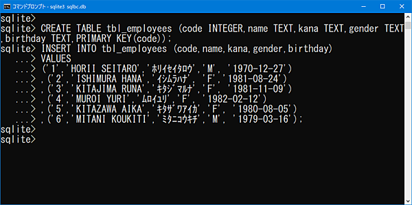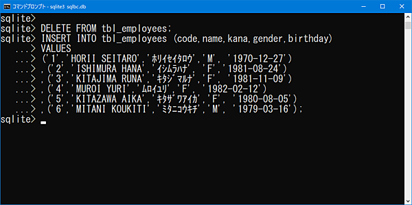 DELETE FROM tbl_employees;【CREATEコマンド】CREATE TABLE tbl_employees (code INTEGER,name TEXT,kana TEXT,gender TEXT,birthday TEXT,PRIMARY KEY(code));【INSERTコマンド】INSERT INTO tbl_employees (code,name,kana,gender,birthday)