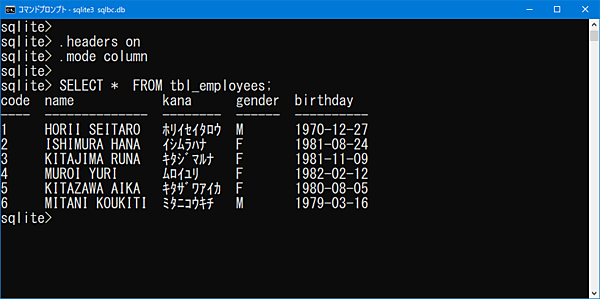 SELECT * FROM tbl_employees;*「.headers」「.mode」は表示内容の設定コマンドなので、ログイン後に1回実行すればOKです。