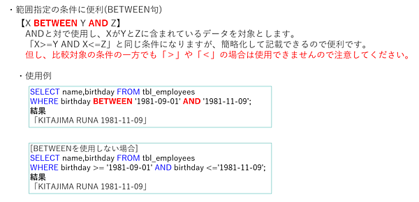 WHERE birthday >= '1981-09-01' AND birthday <= '1981-11-09';このように、BETWEEN句は範囲指定の条件を簡略化して記載できるので便利です。ただし、図でも記載してあるように、比較対象の条件の一方でも「=」がない「>」や「<」の場合は利用できないので注意してください。