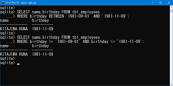 使用例では、誕生日(birthday)が1981年9月1日から1981年11月9日の間にあるデータを抽出しています。また、2つ目のクエリではBETWEEN句を使用せずに、同じ条件のデータを抽出しています。