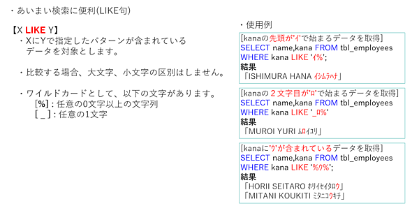 使用例の1番目のクエリでは、「kana」の先頭が「イ」で始まるデータを取得する前方一致検索になります。ワイルドカードの「%」を使用して、先頭文字が「イ」でそれ以降の文字は任意の文字列のデータを取得しています。