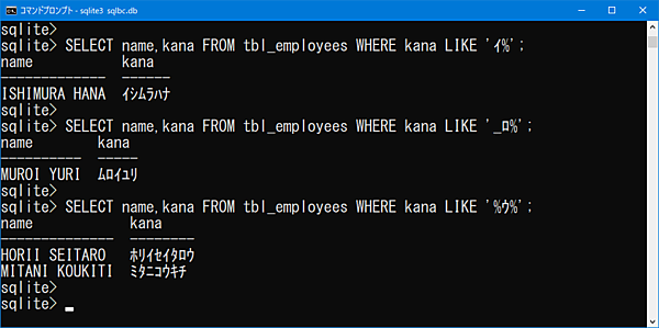 2番目のクエリでは「kana」の2文字目が「ロ」で始まるデータを取得しています。ワイルドカードの「_」を使用して、先頭は任意の1文字で2文字目が「ロ」、そしてそれ以降はワイルドカードの「%」を使用して任意の文字列のデータを取得しています。