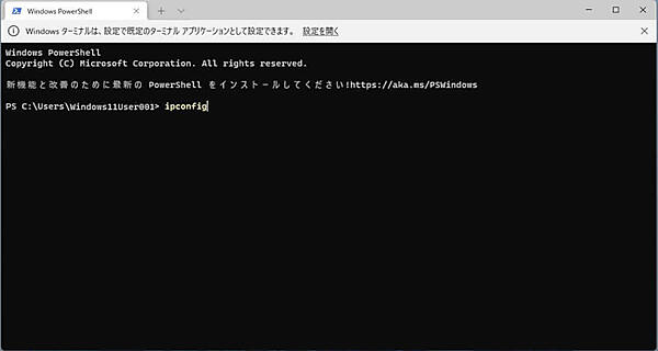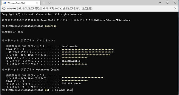 5. Windows Terminalにキーボードより下記コマンドを入力し、ENTERキーを押して表示されたWindowsのIPアドレスをメモします。