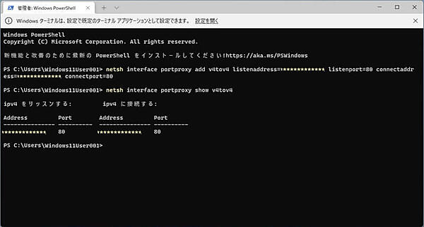 > netsh interface portproxy add v4tov4 listenaddress=WindowsのIPアドレス listenport=80 connectaddress=WSL2のIPアドレス connectport=80