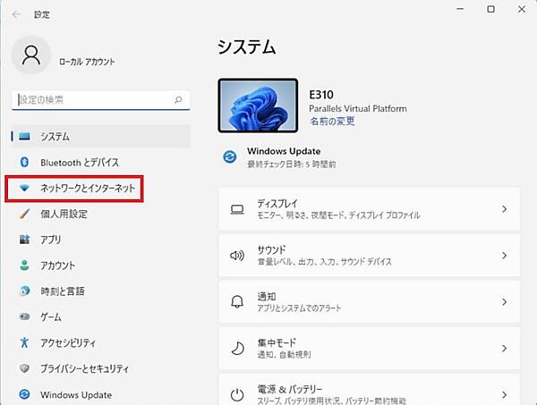 4. 設定ウィンドウが表示されるので左側の「ネットワークとインターネット」をクリックします。