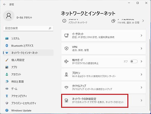 5. 右側にネットワークの設定一覧が表示されるので一番下にある「ネットワークの詳細設定」をクリックします。