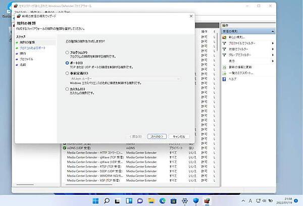 13. 受信設定ウィンドウが開きます。規制の種類の設定は「ポート」を選択して「次へ」をクリックします。