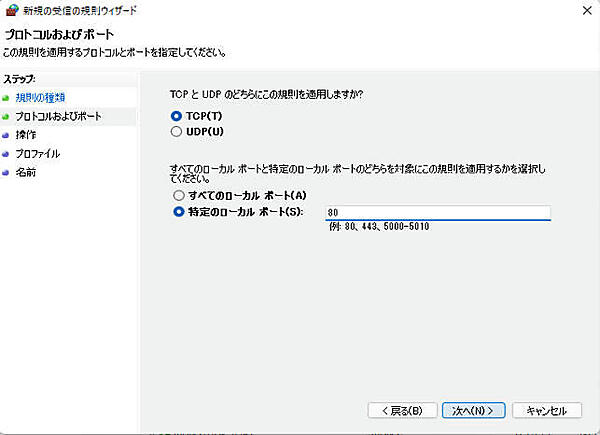 14. ポートの設定へ移ります。「特定のローカルポート」で80と入力して「次へ」をクリックします。