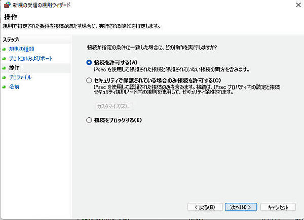 15. 操作の設定へ移ります。「接続を許可する」が選択されている事を確認して「次へ」をクリックします。
