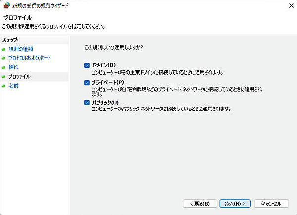 16. プロファイルの設定へ移ります。すべてのチェックボックスにチェックが入っている事を確認して「次へ」をクリックします。