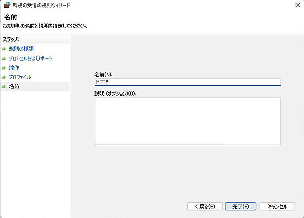 17. 規制名の設定へ移ります。「名前」にHTTPと入力して「完了」をクリックします。