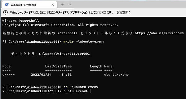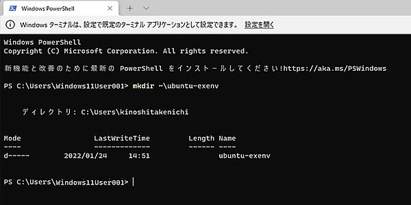 12. Windows Terminalでキーボードより下記コマンドを入力しENTERキーを押して新規にディレクトリを作成します。