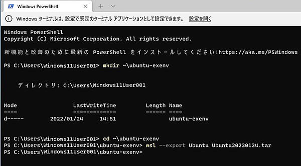 14. Windows Terminalでキーボードより下記コマンドを入力しENTERキーを押して環境をエクスポートします。