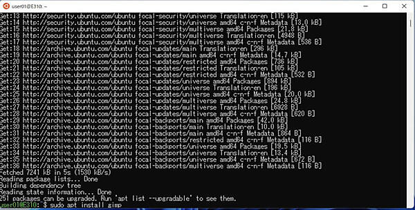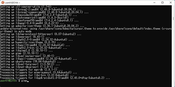 6. パッケージ情報の更新が終了したらキーボードで以下のコマンドを入力しENTERキーを押してGUIアプリケーションをインストールします。今回は、Linux画像編集アプリケーションのGIMPをインストールしてみましょう。