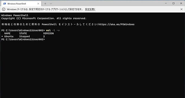 21. Windows Terminalでキーボードより下記コマンドを入力しENTERキーを押してWSL2の状態を確認します。確認したらWindows Terminalを閉じます。