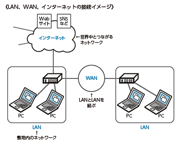 また、ネットワークは企業の事務所や大学などの1つの敷地内(または建物内)で構築されたネットワークであるLAN(Local Area Network)、企業や大学などにて複数の拠点が接続されたネットワークをWAN(ワン、Wide Area Network)と海外のサービスを含めた世界中のサーバ群と接続されたネットワークであるインターネットの3つに分けられます。インターネットは、皆さんが日常的にGoogleやYahoo!、LINEなどのサービスを利用されていることから、最も馴染み深いものでしょう。