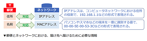 皆さんご存じの通り、ハガキの表に書く2つの情報です。1つは住所、もう1つは名前です。一方、ネットワークの世界でも、住所と名前を使って相手にパケットという手紙を届けています。ただ、ネットワークの世界での住所や名前は、郵便とは別の仕組みです。詳しい説明は割愛しますが、ネットワークの世界で住所に当たるものがIPアドレスです。また、名前に該当するものはMACアドレスです。この2つの情報を使って、相手にパケットという手紙を送ります。