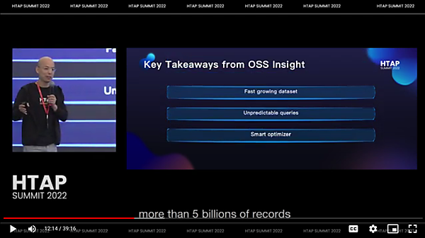 そしてビッグデータの誕生以降、トランザクション処理とオンライン分析を兼ね備え、水平にスケールアウトできるデータベースシステムを簡単に説明することは難しいとして「ここからは例を使って説明しよう」と語り、「OSS Insight」というサイトの概要を説明するデモムービーを紹介した。これはソースコードリポジトリとして世界最大を誇るGitHubのリポジトリをデータソースにして様々な分析を実行するWebサービスであり、バックエンドはPingCAPが開発するオープンソースの分散データベース「TiDB」で実装されている。