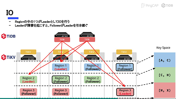 TiDBのアーキテクチャーを解説したスライドではGoogleがSpannerを開発する際の発想と同じでデータベースの役割を明確に分離したこと、それぞれが分散処理によってスケールアウトを可能にしたことを示している。この分散構造にはマスターとなるリーダーノードを固定せずに動的な分散処理を行うため「Raft」と呼ばれる分散合意アルゴリズムを利用している。これはクラウドネイティブなコンテナーオーケストレーションツールの代名詞であるKubernetesの中核であるデータストア、etcdも利用する堅牢かつ高速な分散処理技術だ。